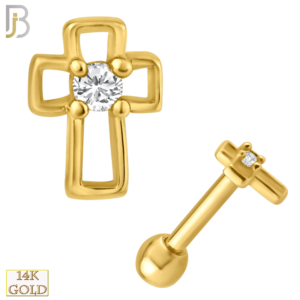 14-TB34 – 14k Solid Gold Hollow Cross with Single CZ Tragus Barbell Cartilage Piercing Screw Ball