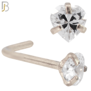 NR42L – 316L Surgical Steel L-Shape Nose Ring with 3mm Heart Shaped Clear Zircon in Three Prong Setting (PACK OF 6)