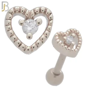 TB43 – 316L Stainless Steel and Brass Hollow Heart with Zircon Center Design Tragus Barbell Cartilage Piercing Screw Ball (PACK OF 6)