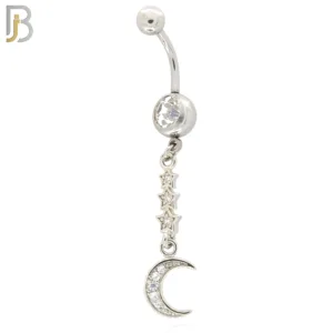 N021 – 316L Stainless Steel Dangling Triple Star with Crescent Moon with Zircon Design Belly Ring with 5mm Screw Ball