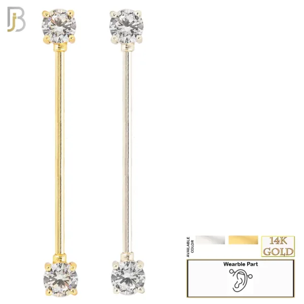 14k Solid Gold Industrial Straight Barbell with Round Clear CZ Externally Threaded