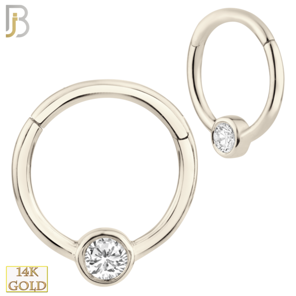 14-CT62 – 14K Solid Gold Hinged Hoops Single Zircon in Bezel Setting