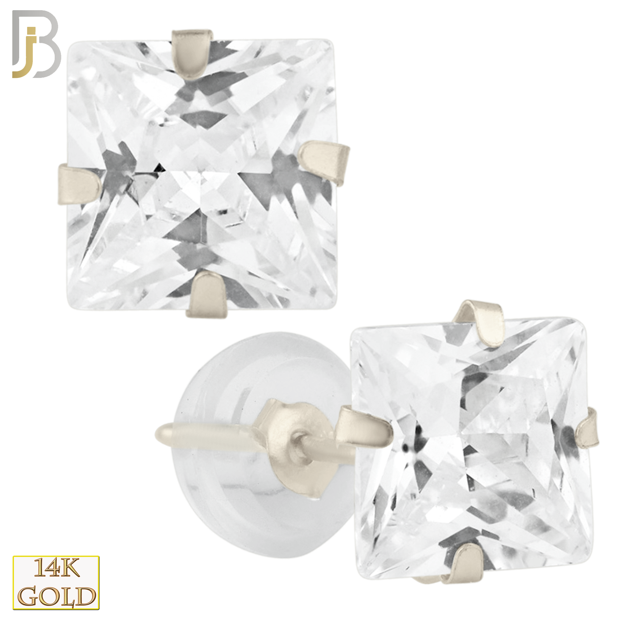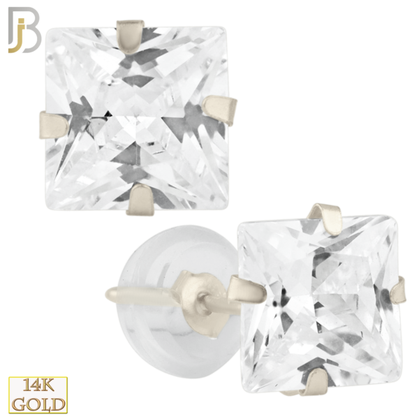 14k White Gold Silicone Back Stud Earrings Stamping Prong Setting with Square Clear Zircon