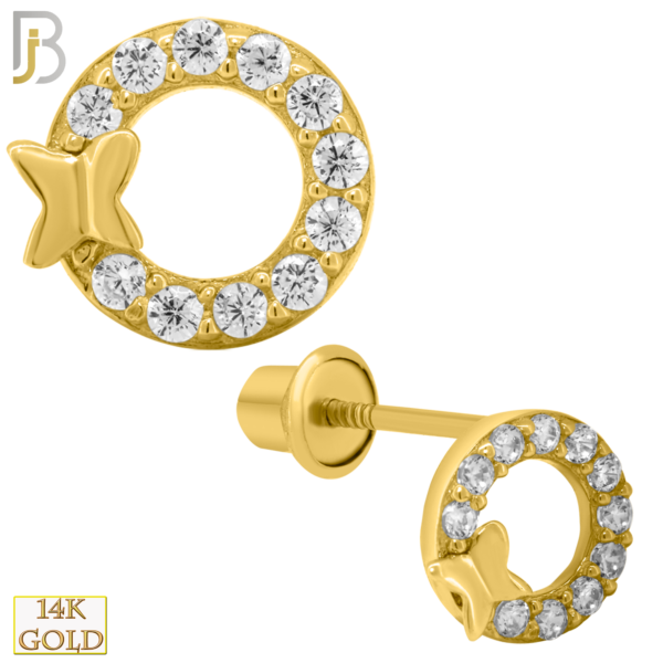 14k Solid Gold Round with Butterfly Design Earring Stud with Clear Zircon (5.8mm w x 6.3mm h)