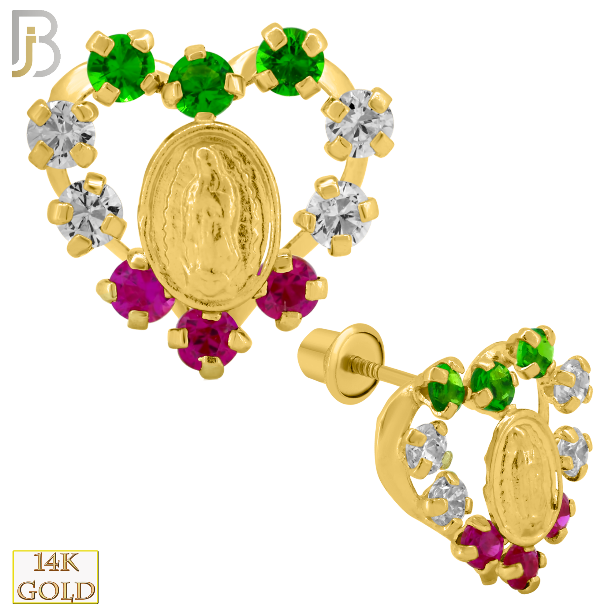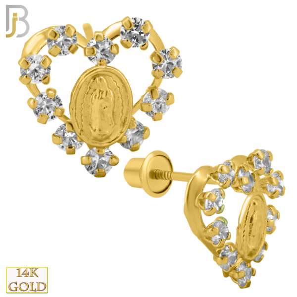 14k Solid Gold Hollow Heart with Mary Design Earring Stud with Clear Zircon