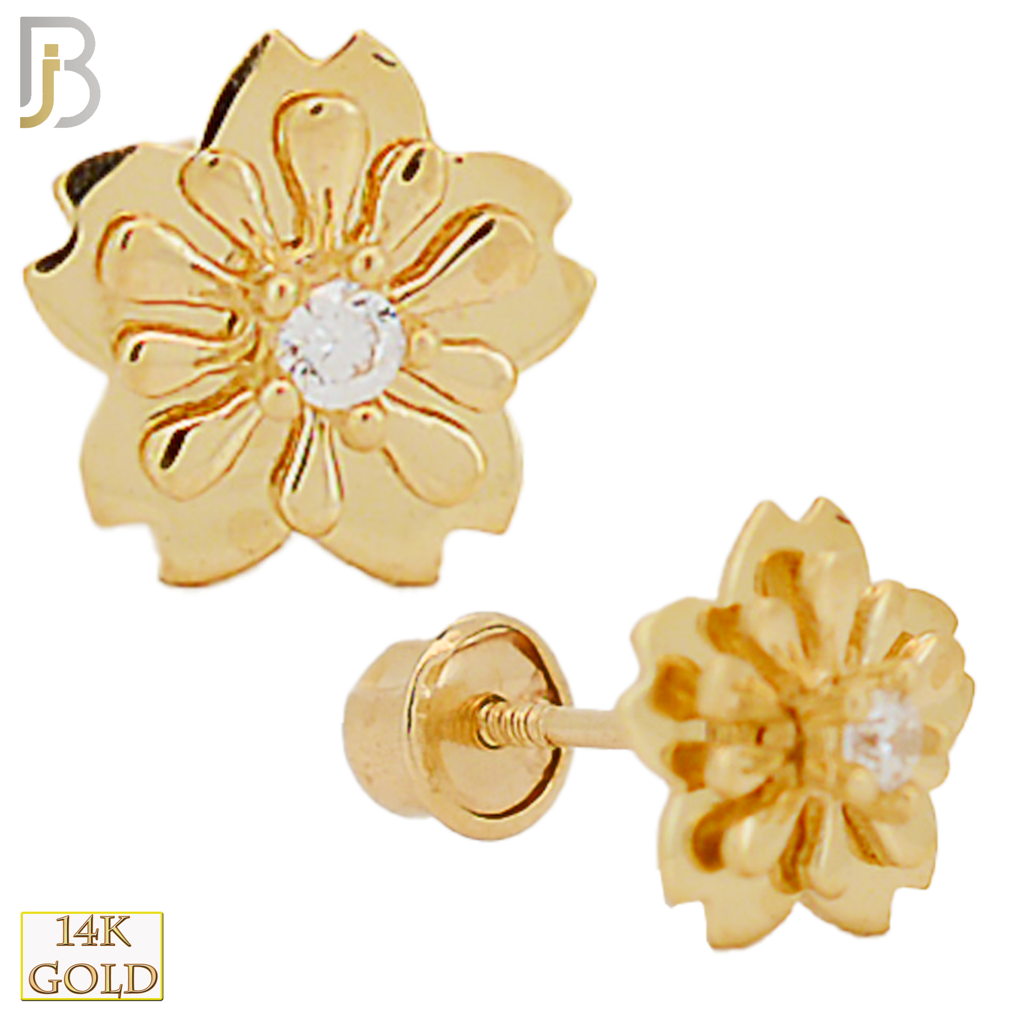 14k Solid Gold Screw Back Flower Stud Earring with Center CZ stone