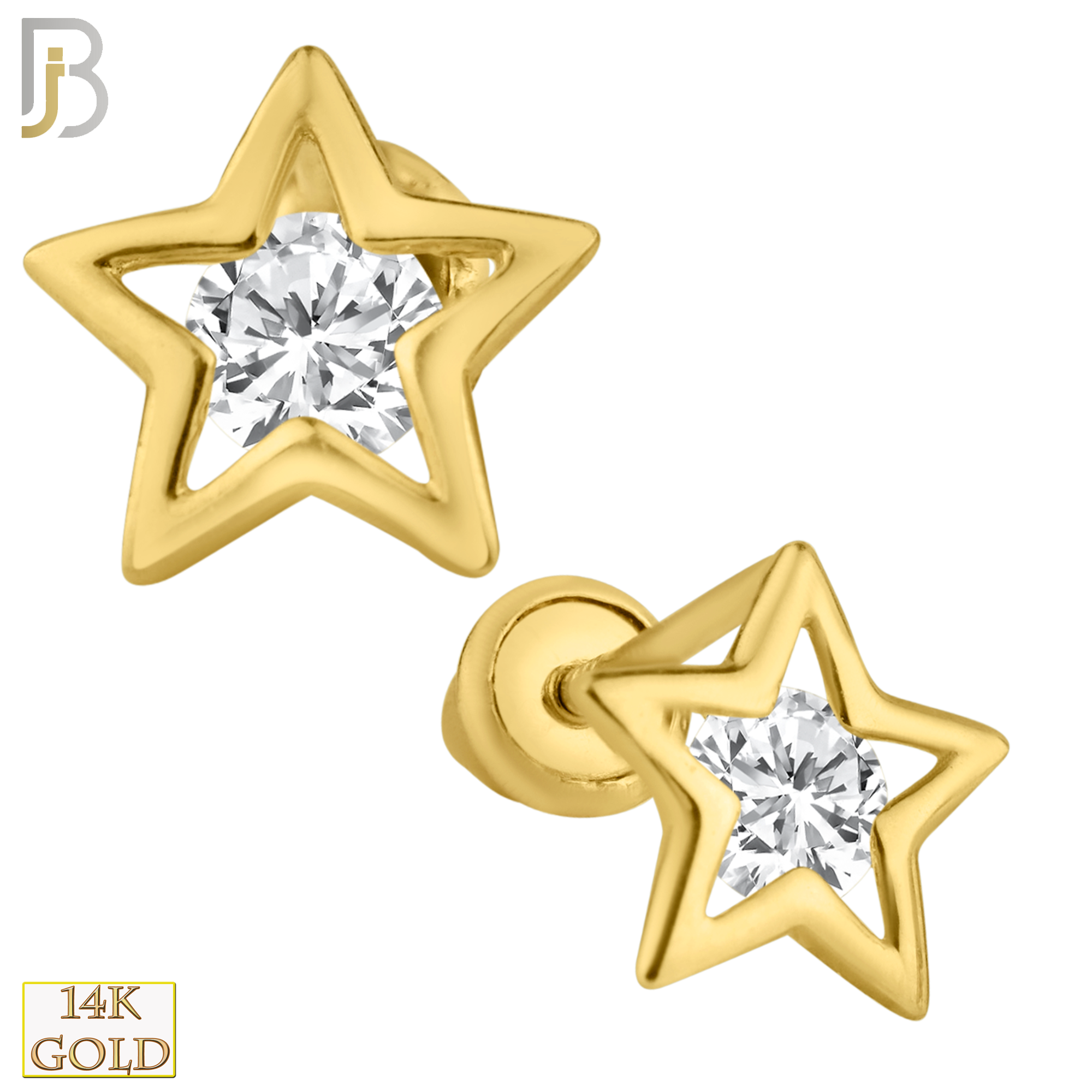 14k Solid Gold Hollow Star with Round CZ Center Stud Earrings