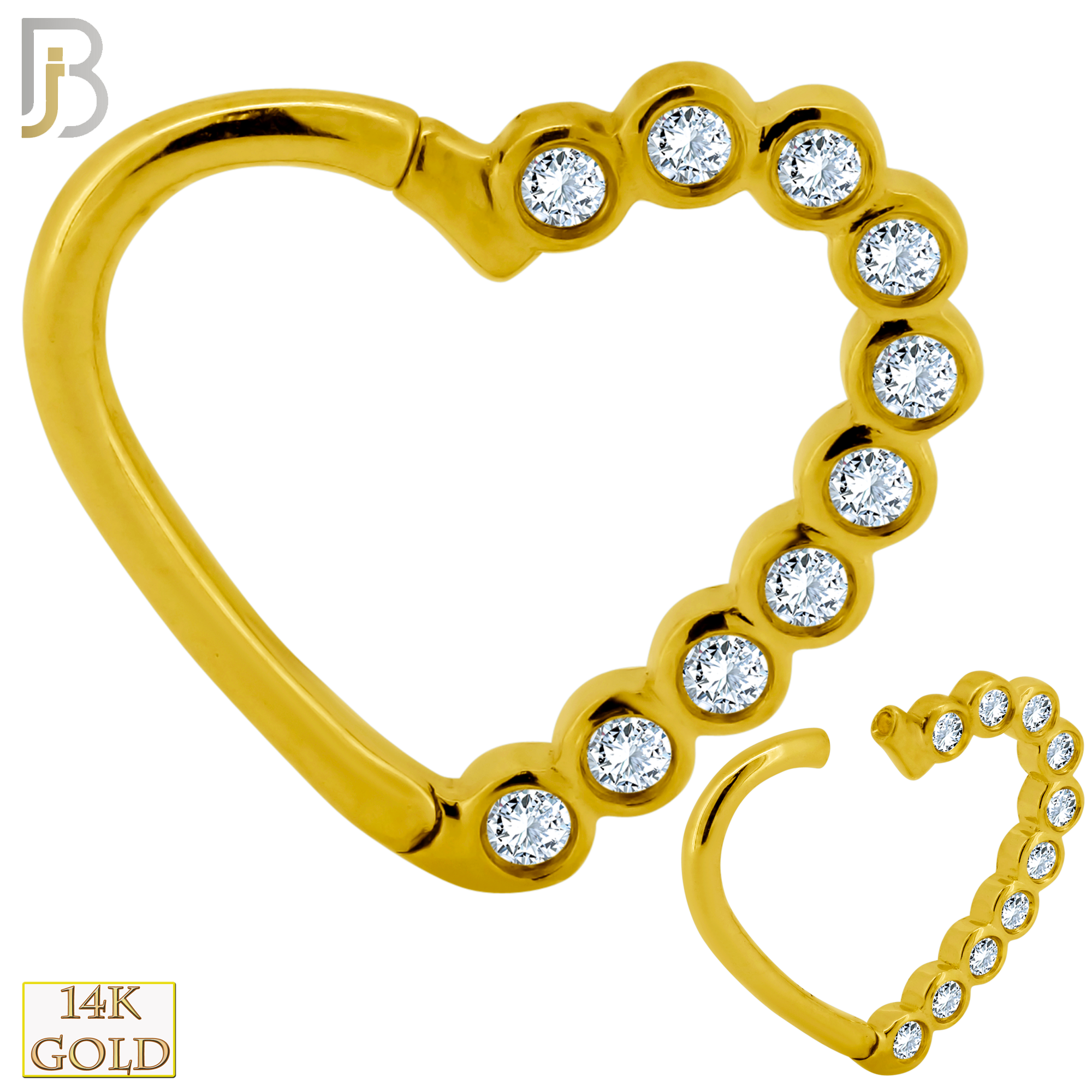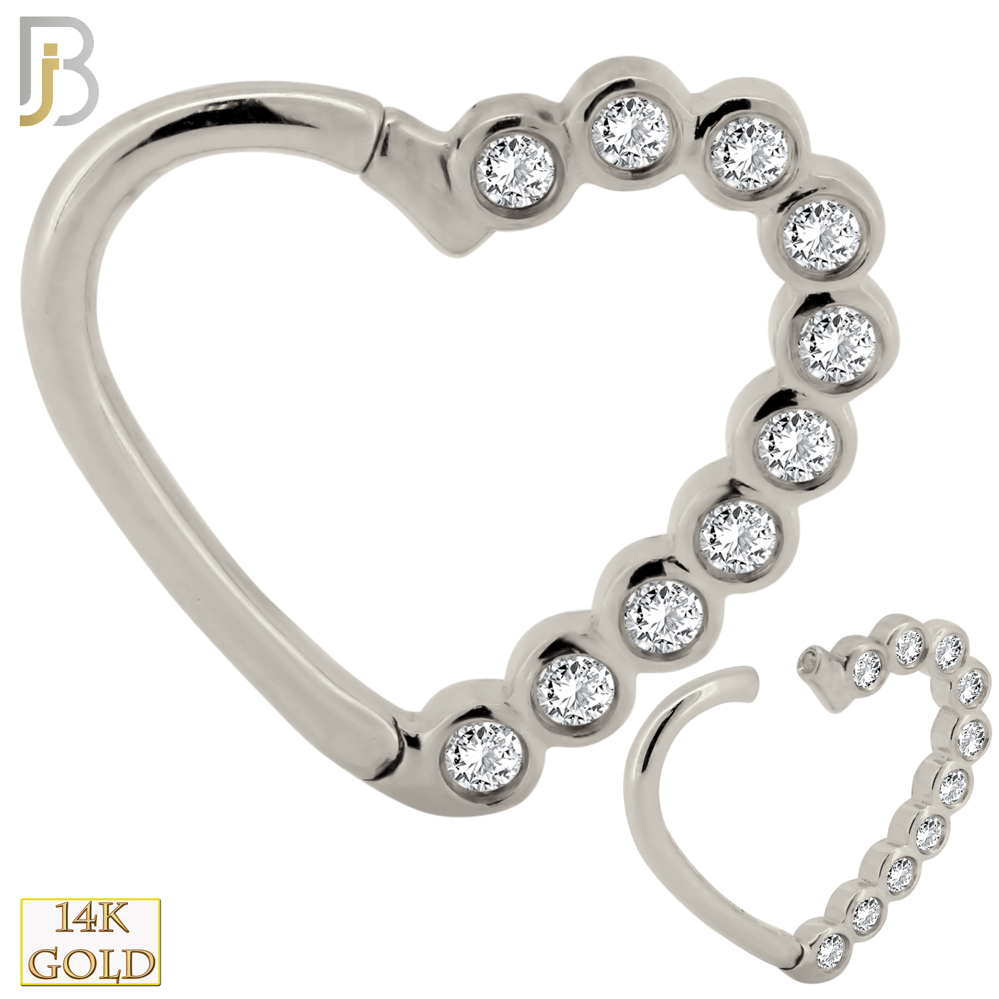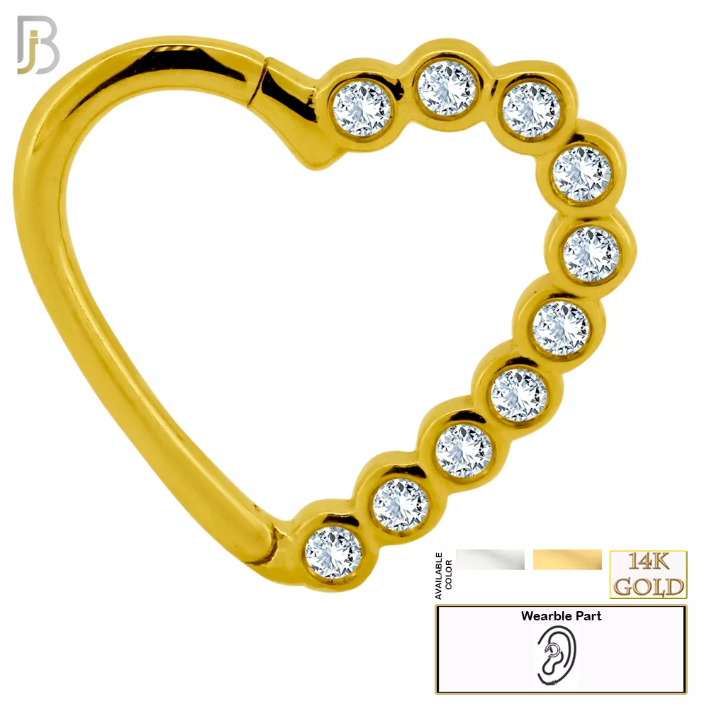 14K Solid Gold 18g Thickness Hollow Heart with Multi CZ in Half Right Hinged Hoop