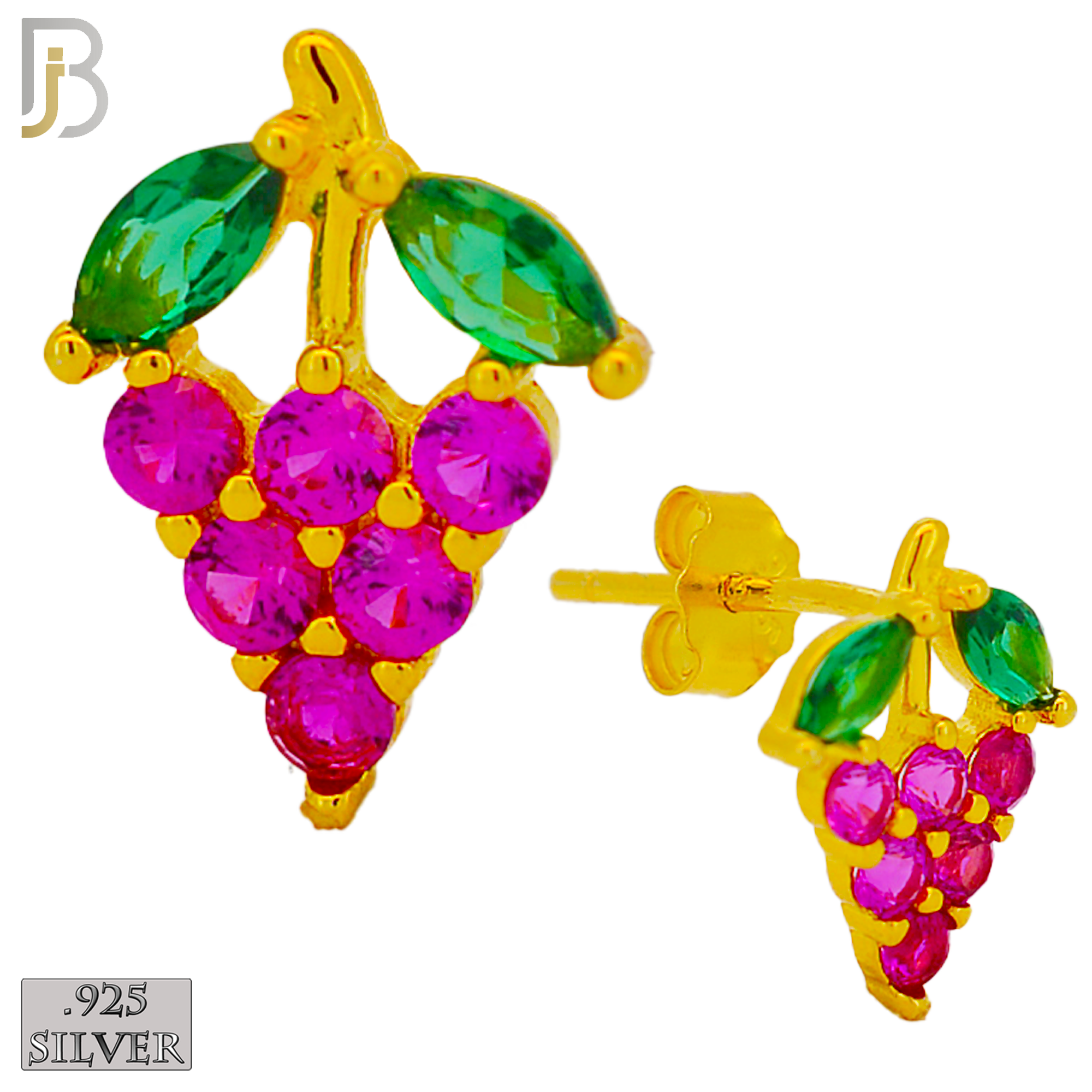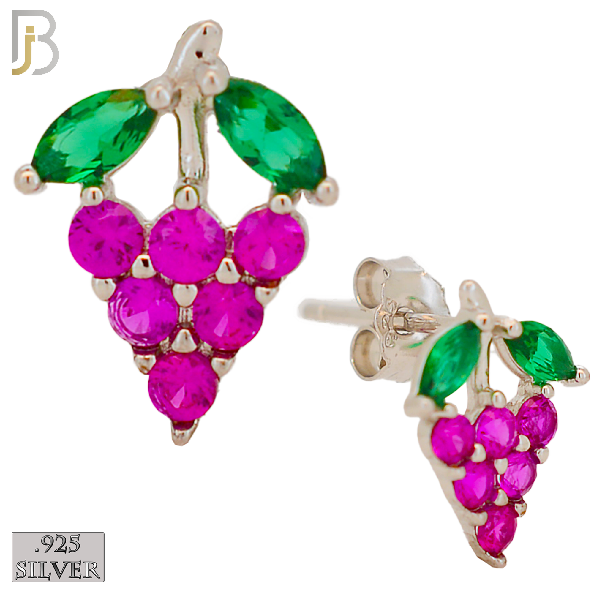 Design: Grapes Design Earring Stud with Fuchsia Zircon for the Grapes and Green for the Leaves