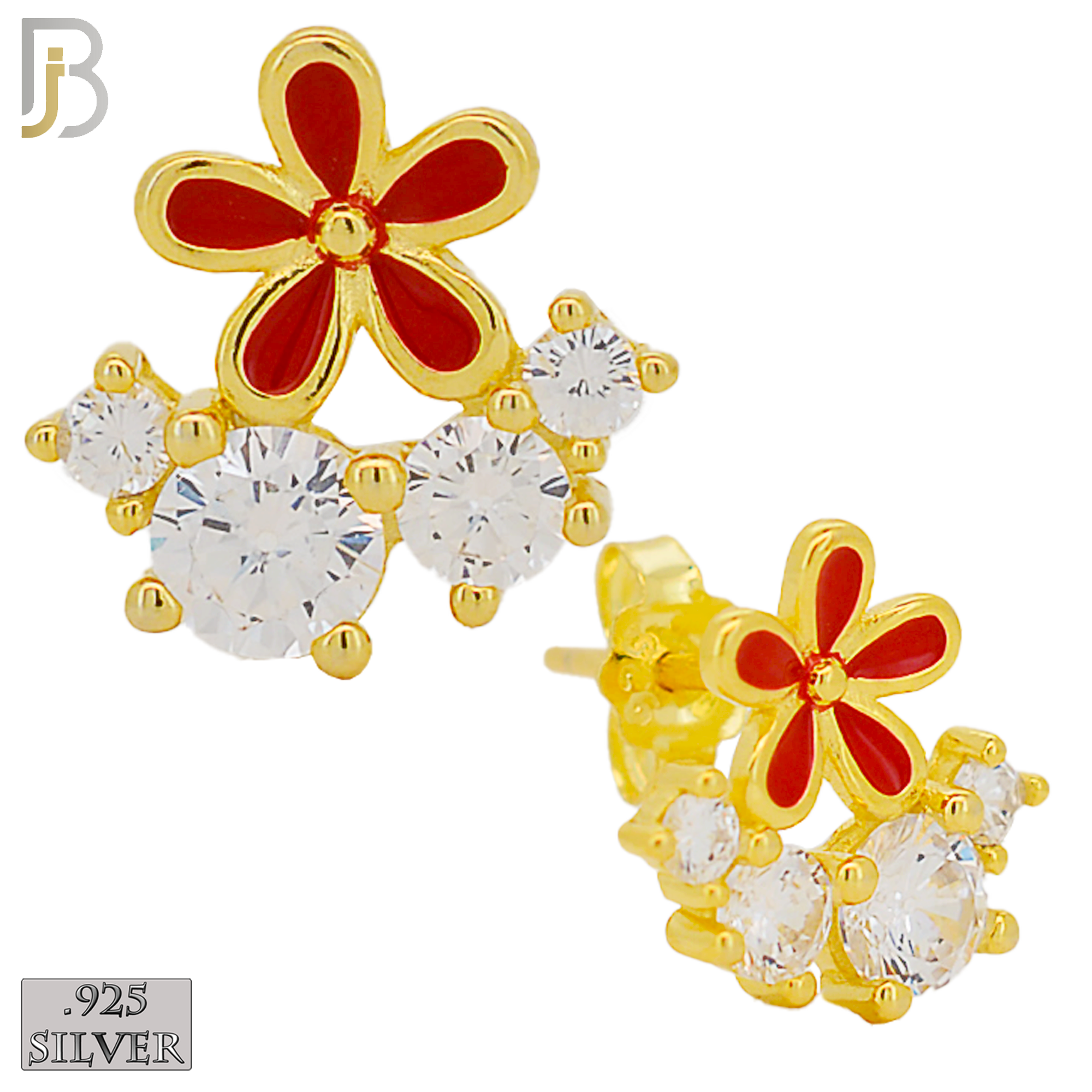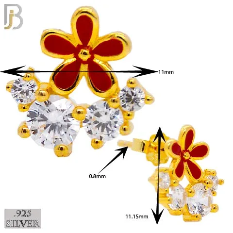 .925 Sterling Silver Red Flower with Four Zircon Design Earring Stud