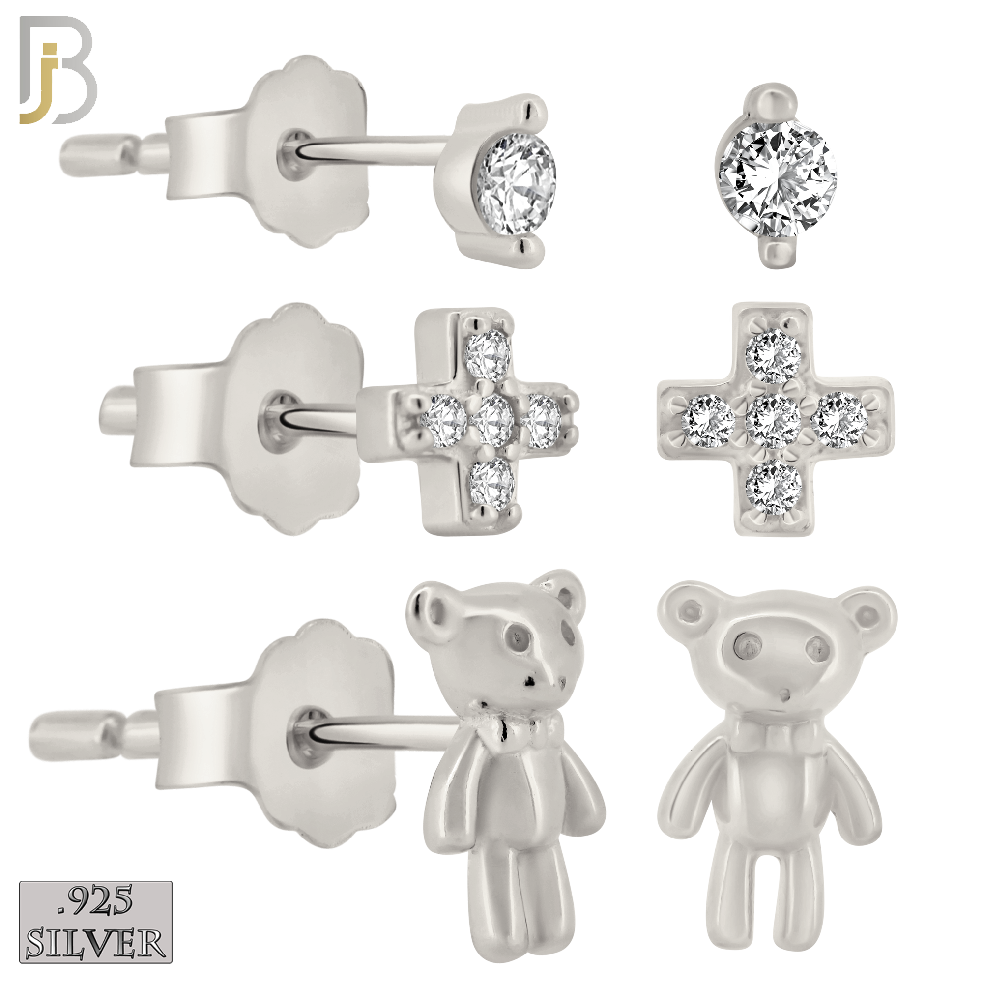 .925 Sterling Silver Three Set Stud Earrings (Single CZ in two Prong, Cross & Heart Mismatched, Teddy Bear)