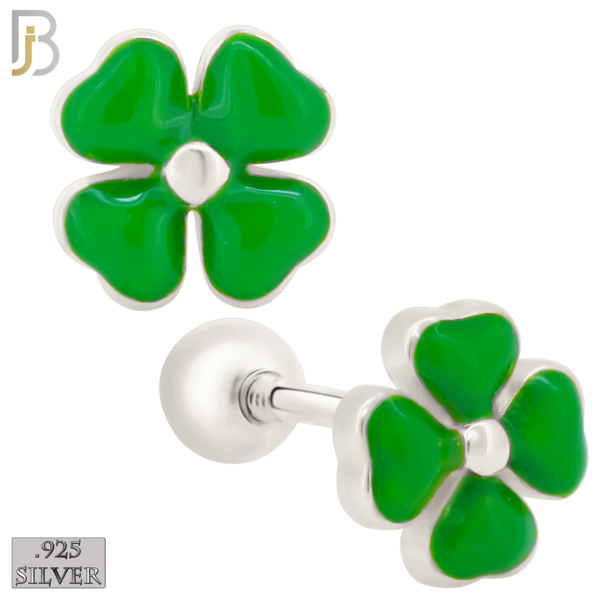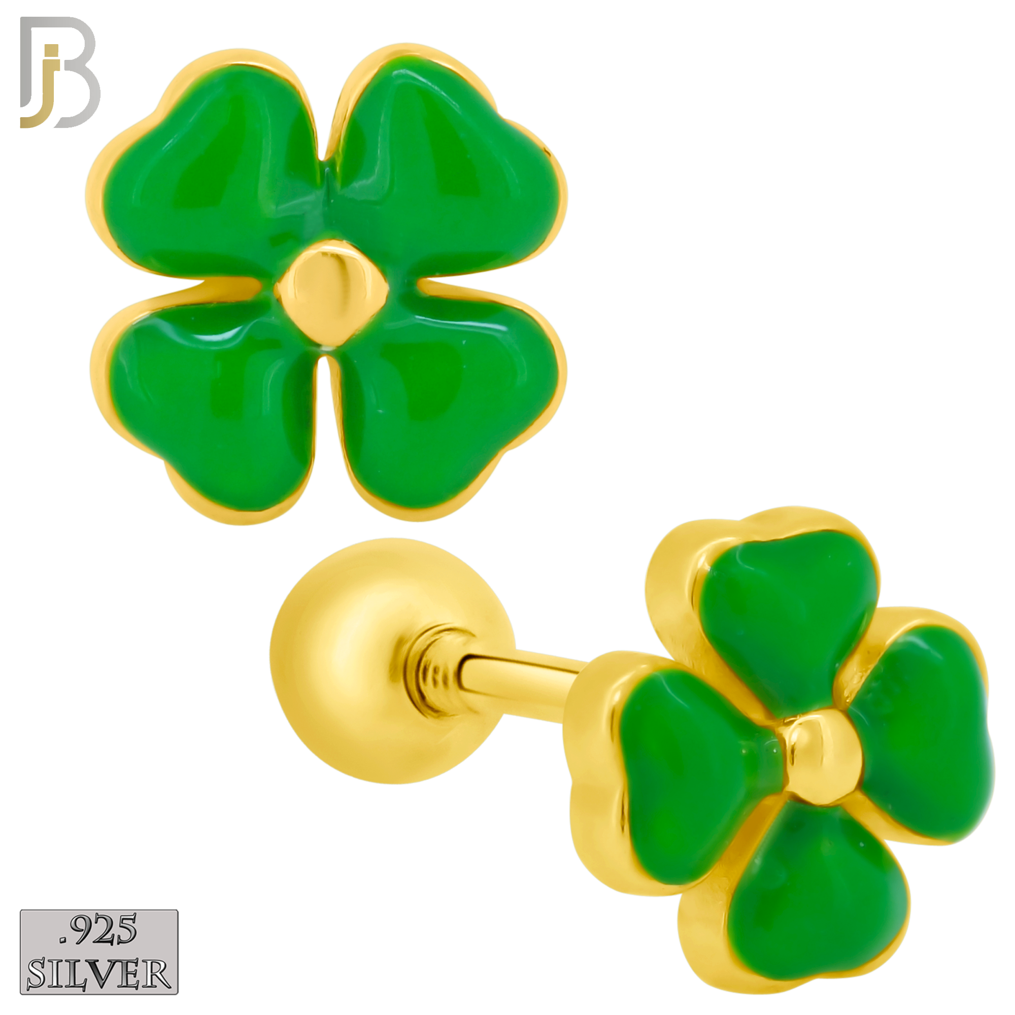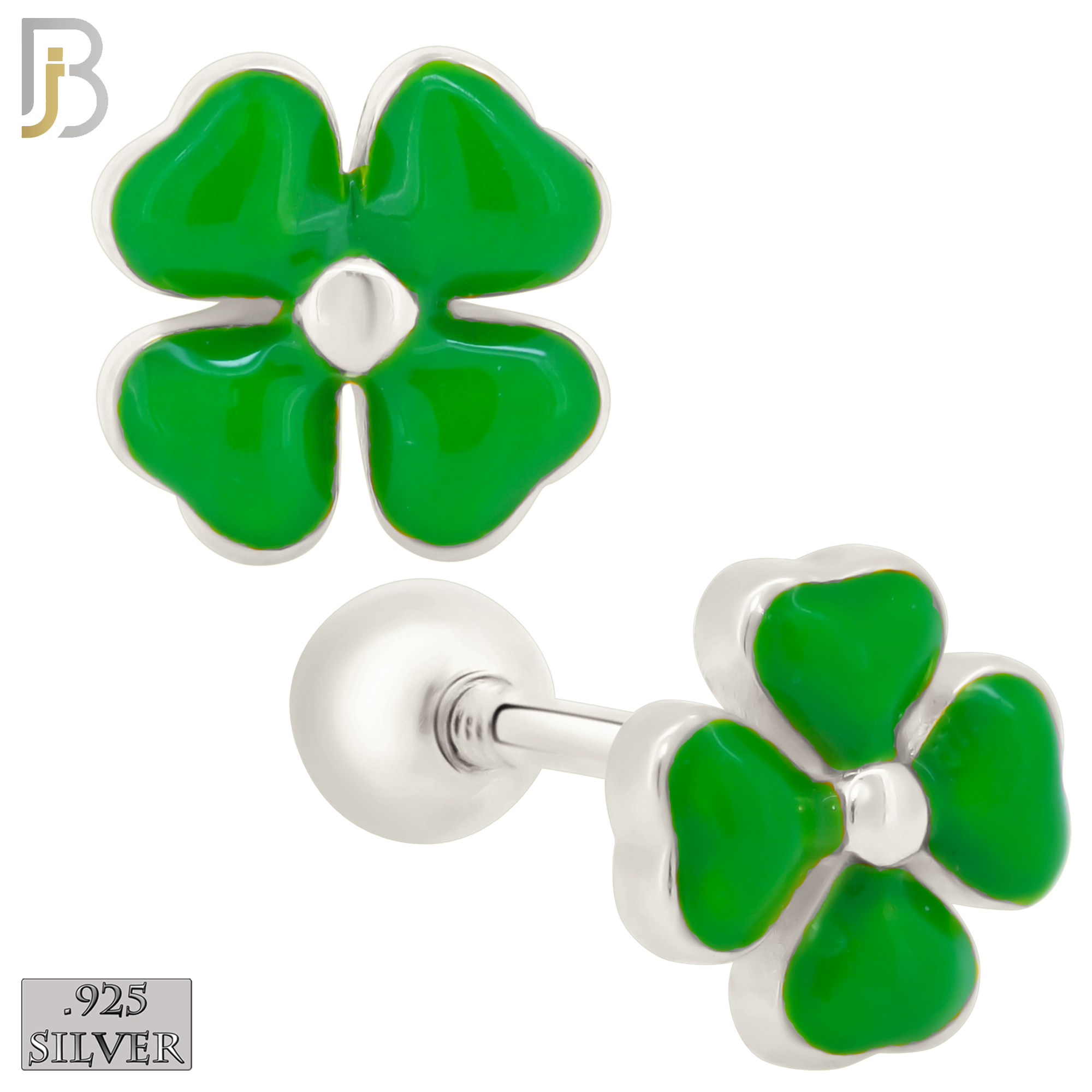 Screw Ball Back – .925 Sterling Silver Green Enamel Four Leaf Clover Earrings Stud