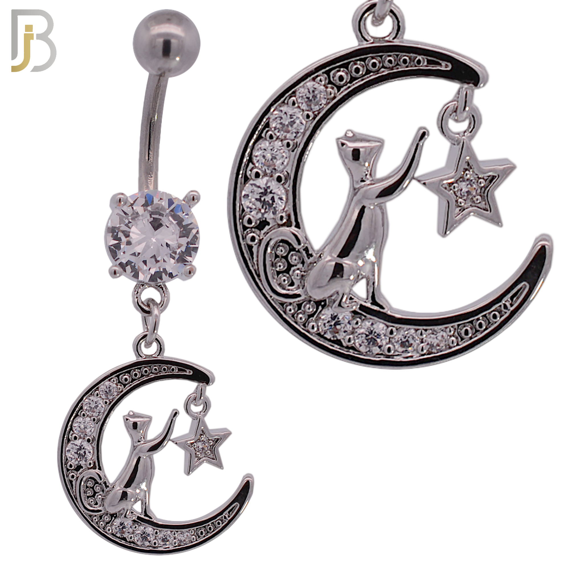316L Stainless Steel Dangling Moon with Cat and Star and Multi Zircon Belly Ring