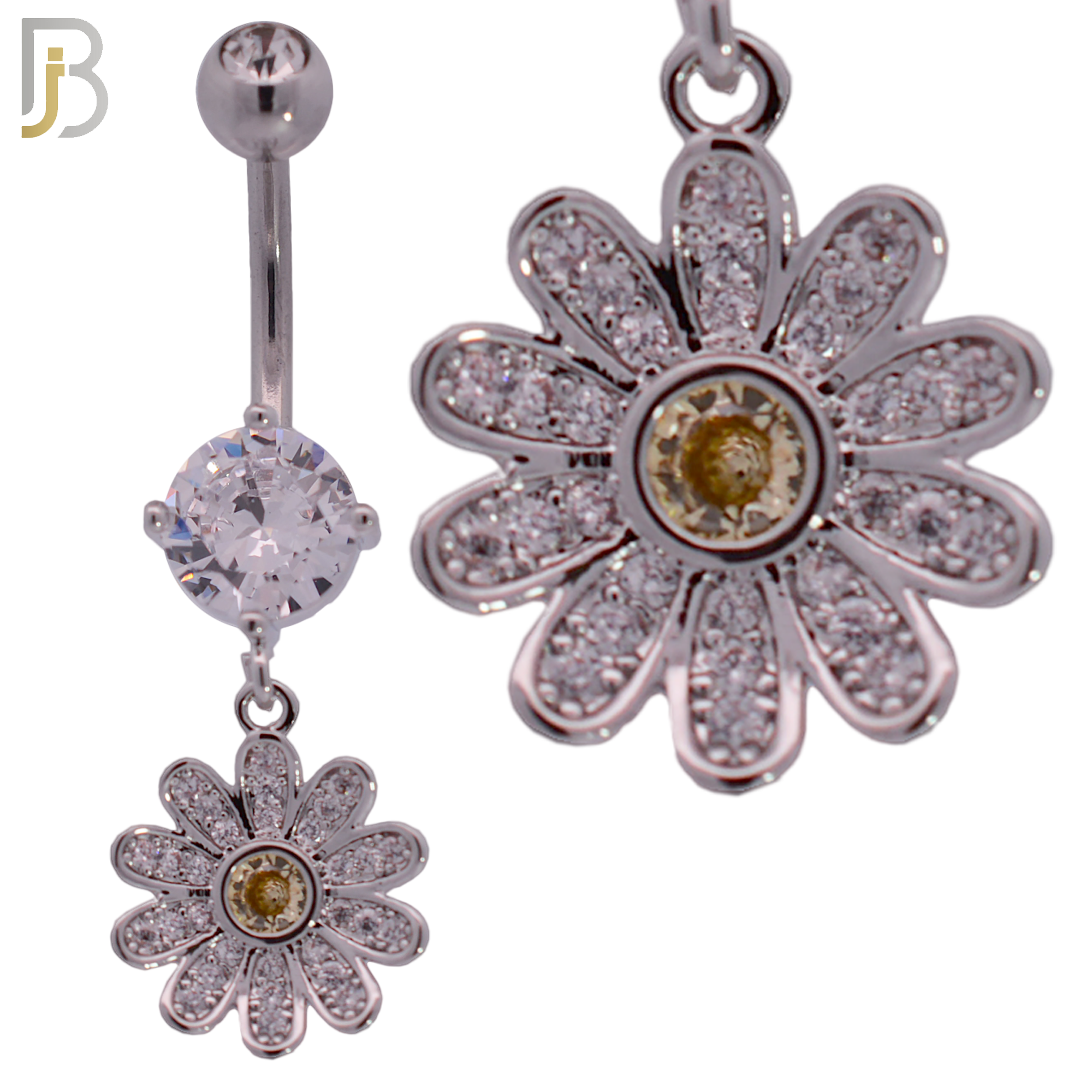 N0126 – 316L Stainless Steel Dangling Flower with Yellow Round Center Zircon Belly Ring