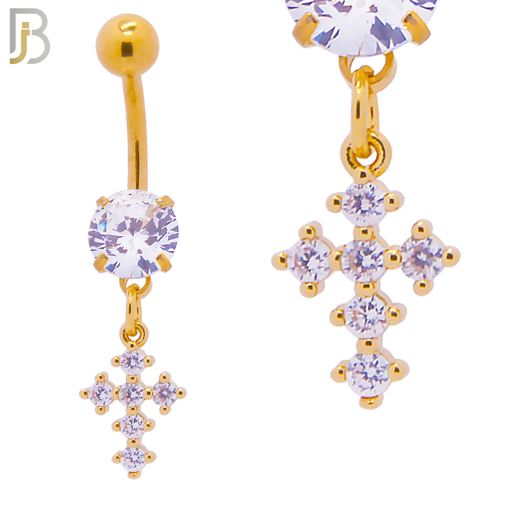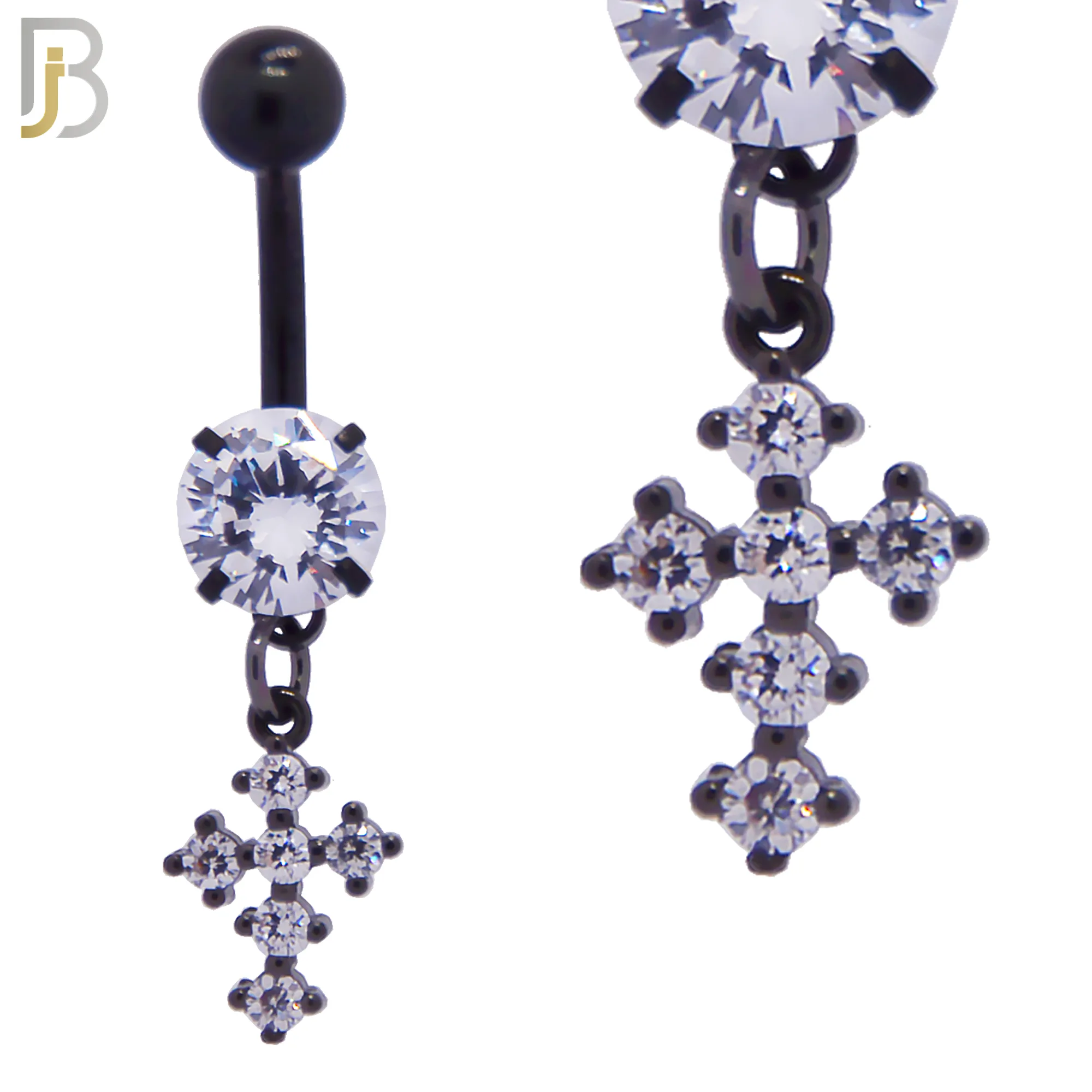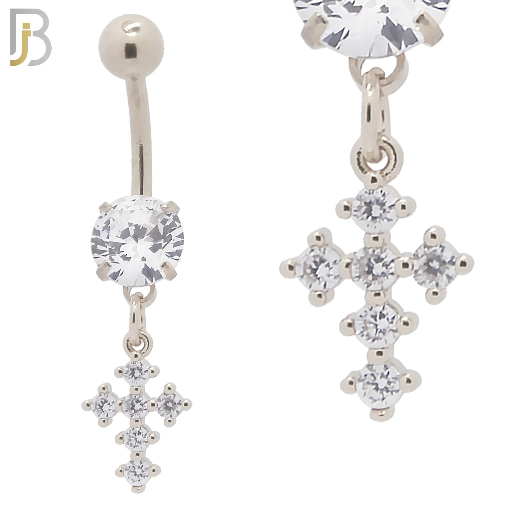 N042 – 316L Stainless Steel Dangling Prong Cross with Zircon Design Belly Ring with 5mm Screw Ball