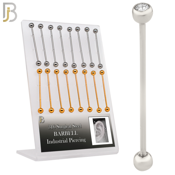 316L Surgical Steel Industrial Barbell with One Ball with Zircon (Other Ball is Plain) External Threaded Pack of 16