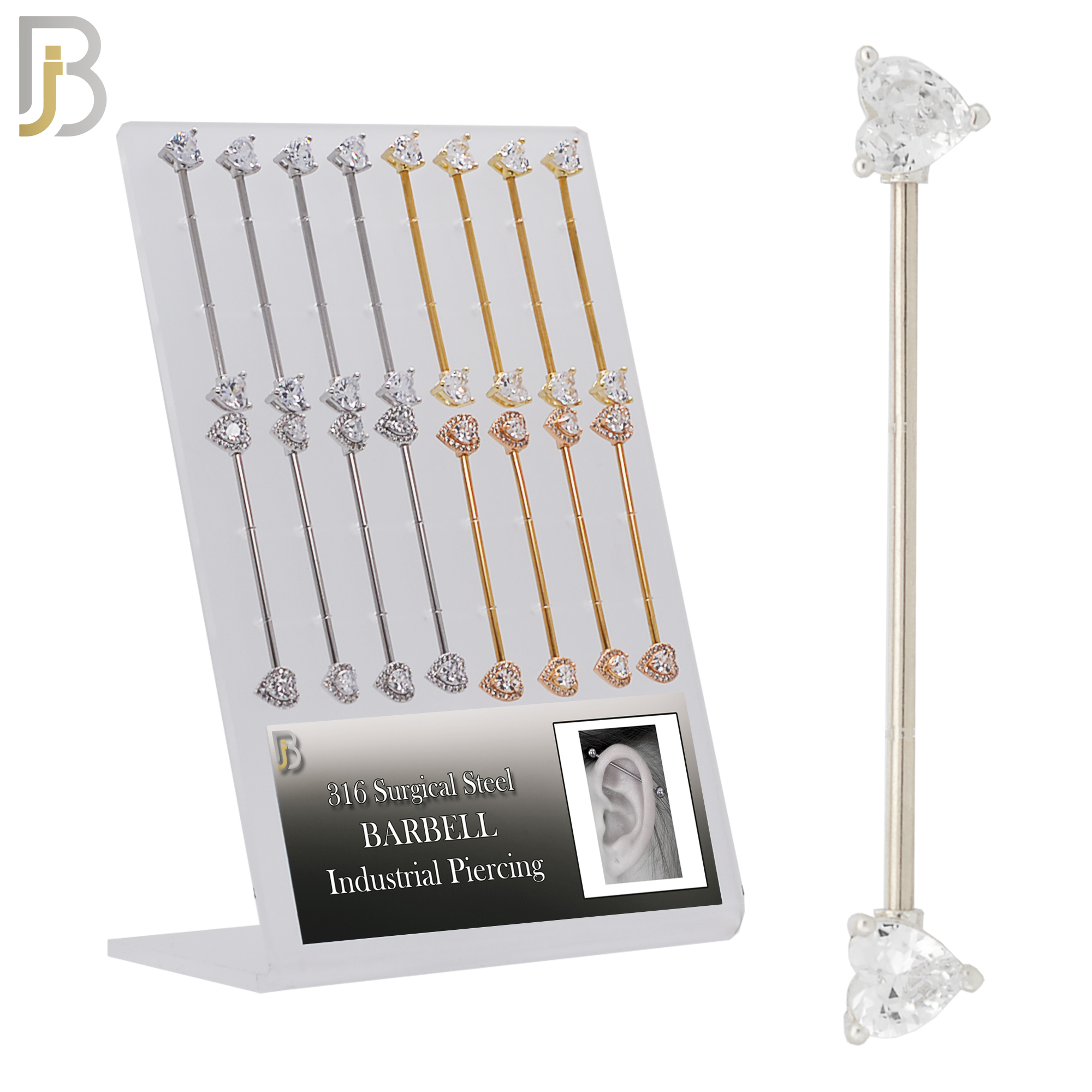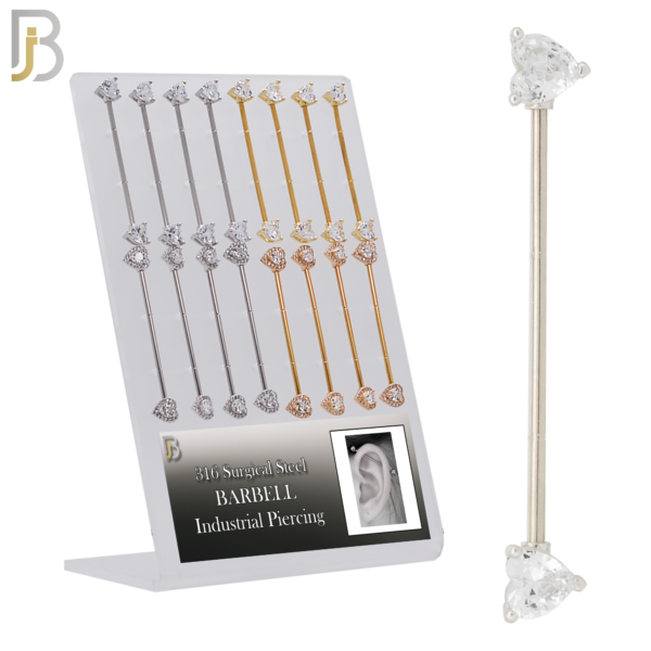 316 Surgical Steel Industrial Barbell with Heart Shaped CZ Design Pack of 16