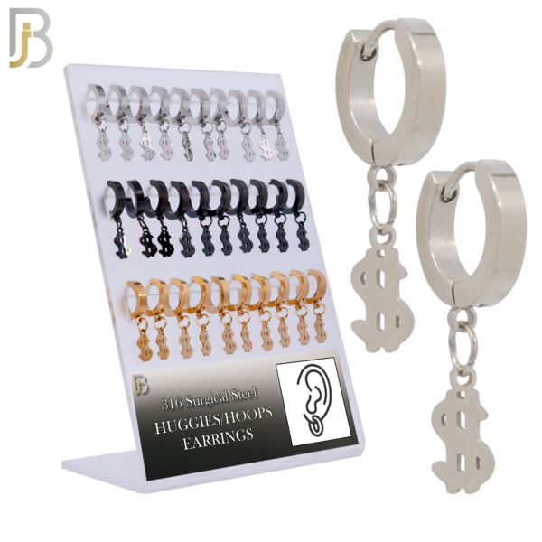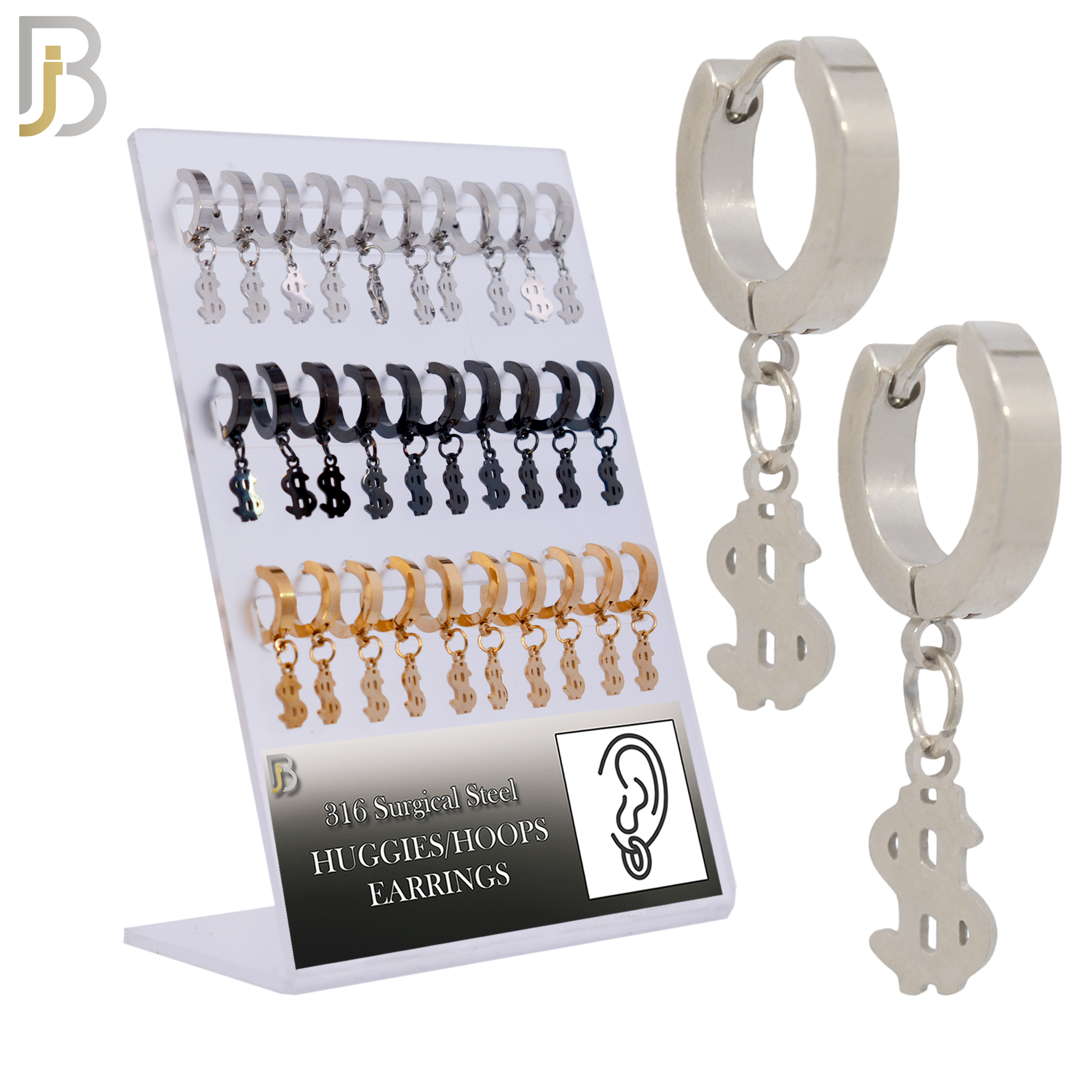 316L Stainless Steel Huggies Hoops Earrings with Dangle Dollar Sign Pack of 15 Pairs