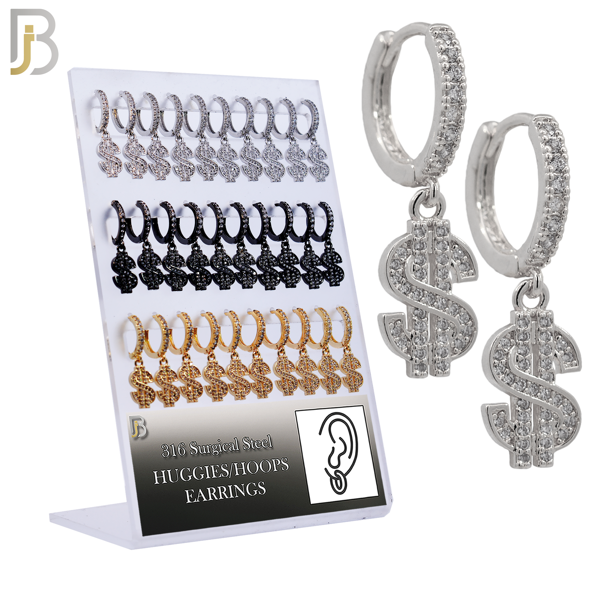 316L Surgical Steel Dangling Dollar Sign with Zircon Huggies Earrings – Pack of 15 Pairs