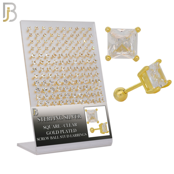 925 Sterling Silver Gold Plated Earring Stud with Screw Ball Backing, Casting Prong Setting and Square Clear Zircon