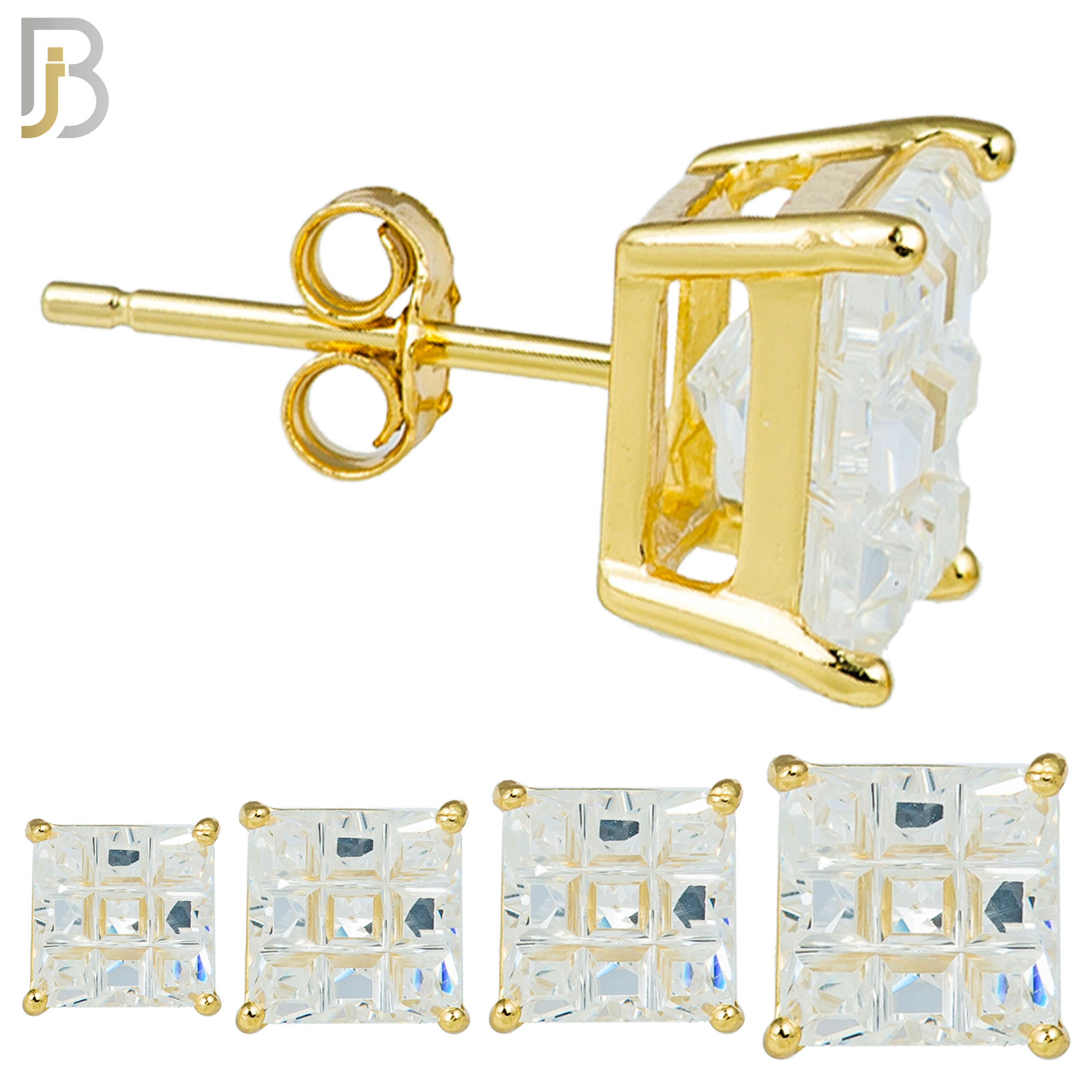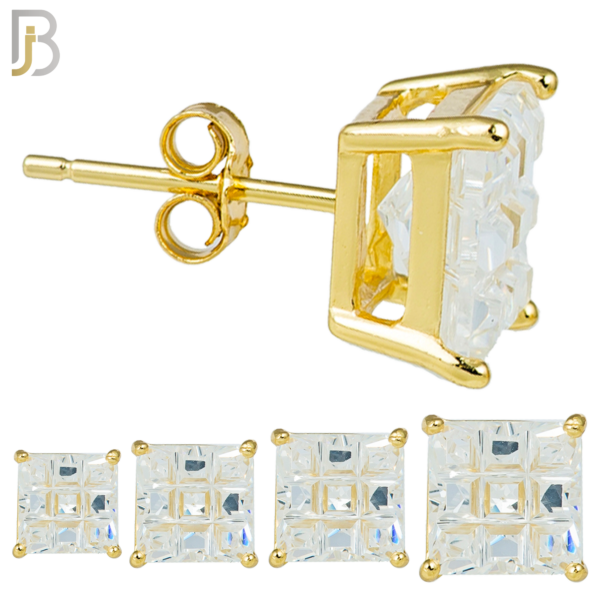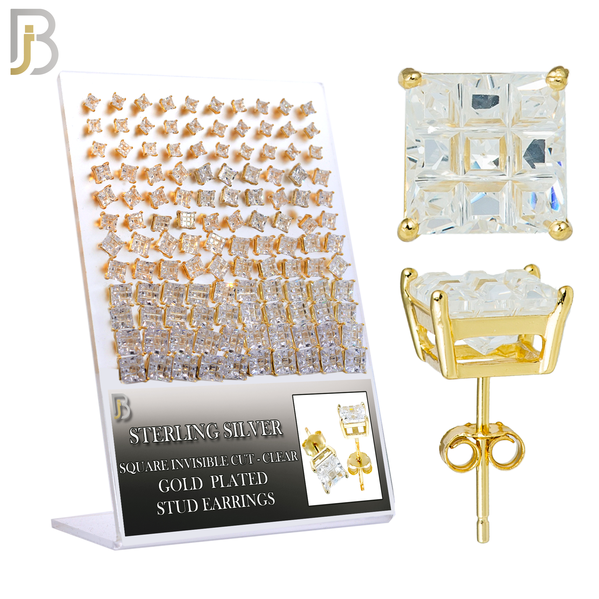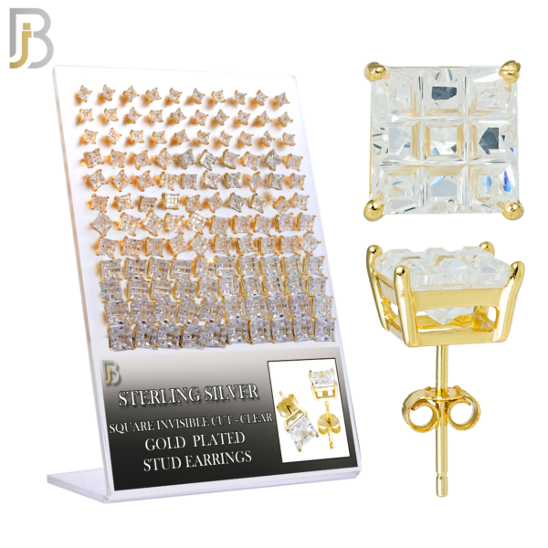 .925 Sterling Silver Gold Plated Push Back Earring Stud Casting Square Princess Invisible Cut Prong Setting Clear Zircon Pack of 60 Pairs
