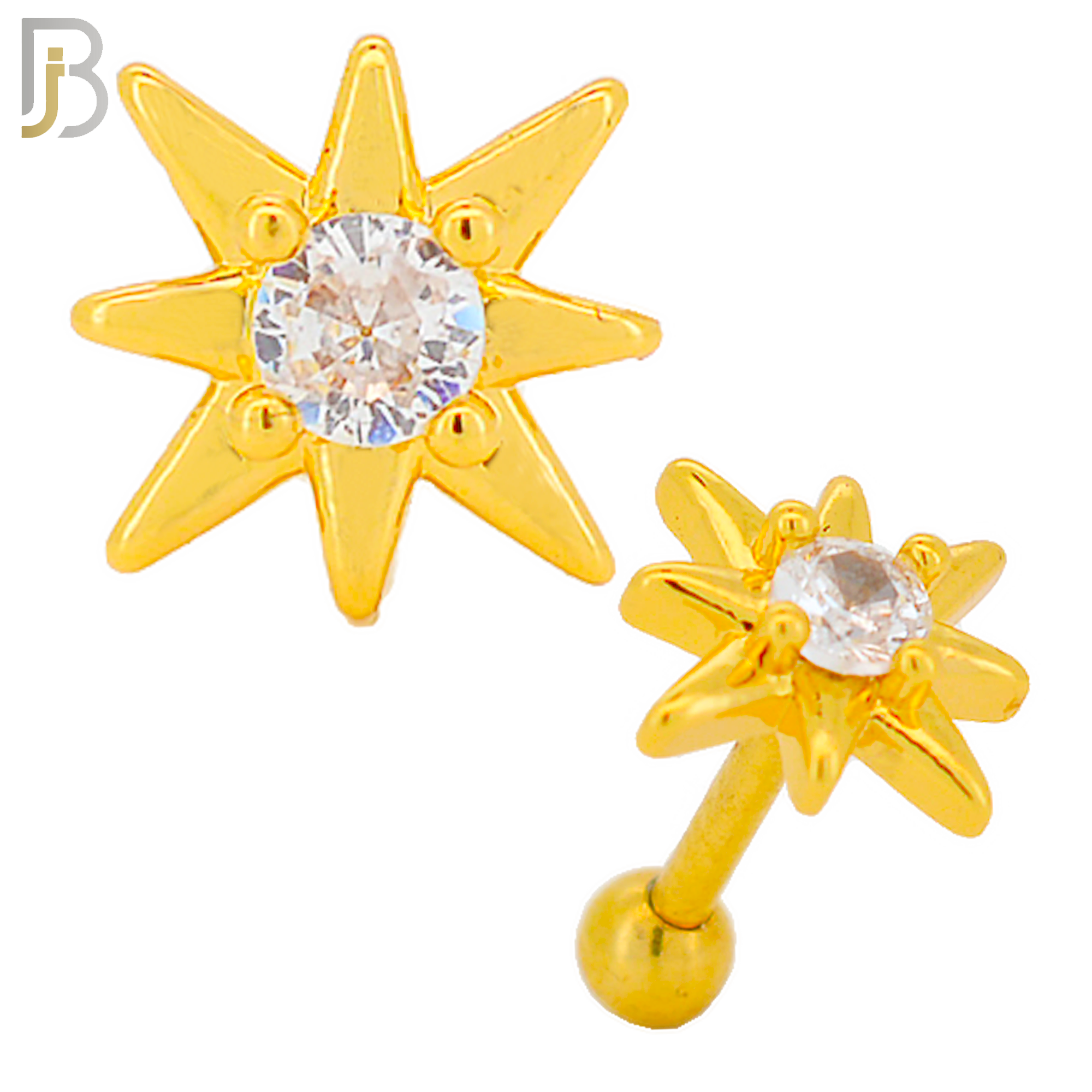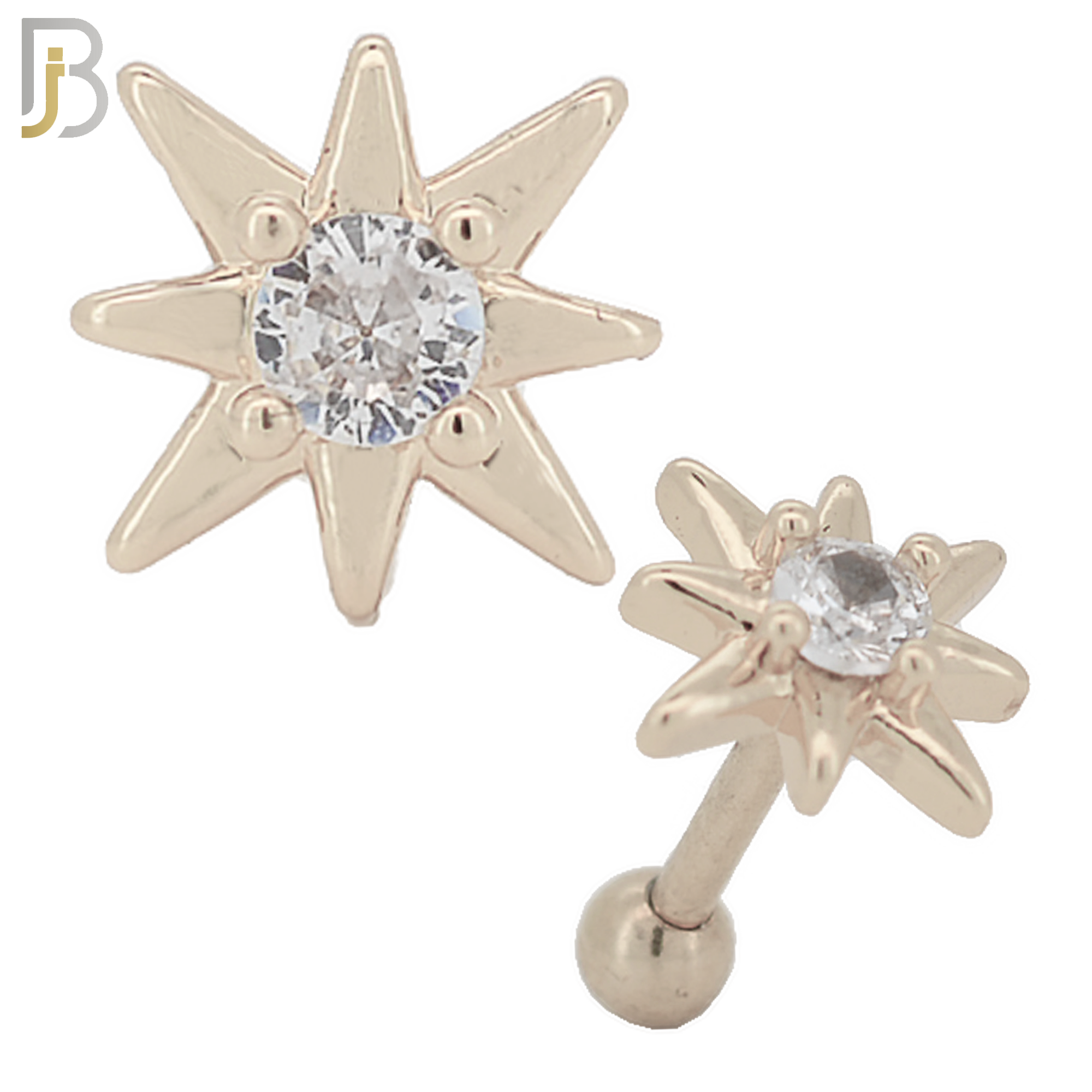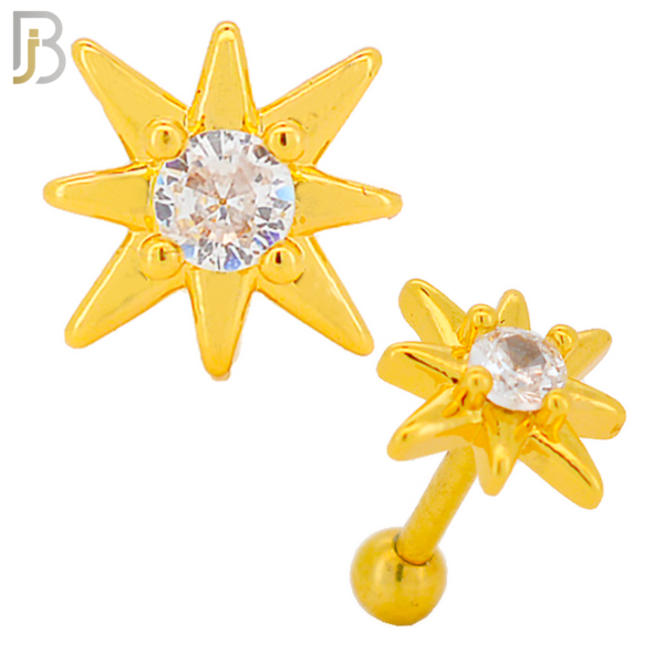 316L Stainless Steel and Brass Starburst Design with Clear Center Zircon Tragus Barbell Cartilage Piercing Externally Threaded