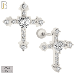 ES269 – Screw Ball Back – .925 Sterling Silver Cross with Prong Set Heart Shaped Zircon Center Stone Earrings Stud