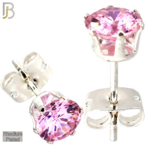 ES04R-SPT – 316L Stainless Steel Rhodium Plated Stamping Round Prong Setting with Pink Topaz Zircon (October Birthstone)