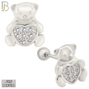 ES372 – Screw Ball Back – .925 Sterling Silver Bear with Pave Heart Shaped Center Stud Earrings
